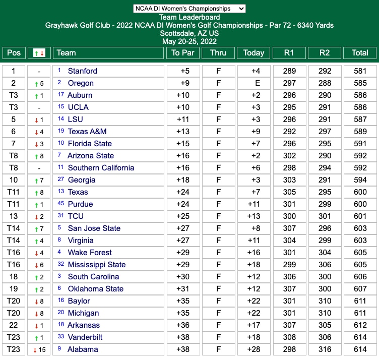 The first groups teed off at 9:30 a.m. ET/6:30 a.m. PT at the 2022 NCAA DI Women's Golf Championships at Grayhawk Golf Club in Scottsdale, Ariz., to start the second round on Saturday morning. Stanford (+1) took a three-stroke lead over Texas A&M (+4) into the second round after shooting an opening-round 289.