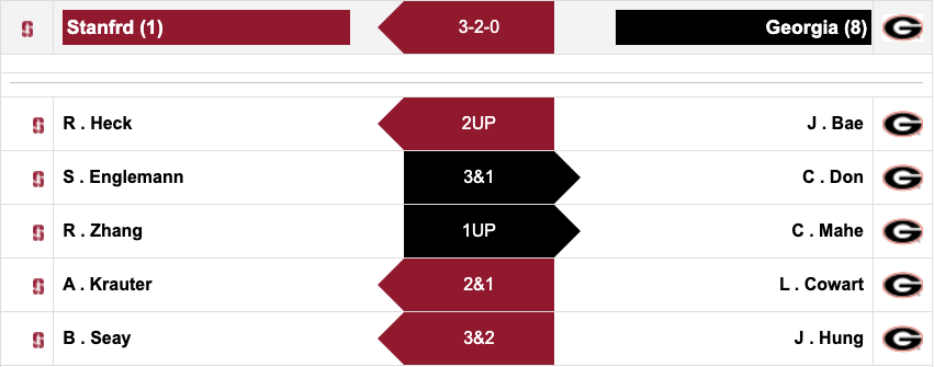 Although Stanford came into match play as the top team, featuring the last two individual champions, Georgia took them down to the wire. Rachel Heck and Brooke Seay closed won their matches on the final two holes of the day to claim the first two points for the Cardinal. This year's individual champ, Rose Zhang, wasn't able to get a point for her team as she dropped her match on the final hole to UGA's Candice Mahe.