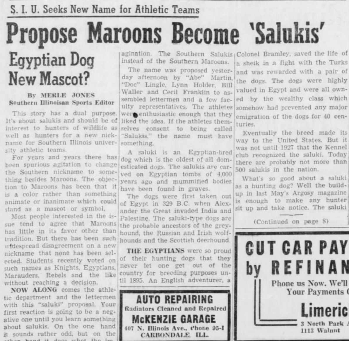 "Your first reaction is going to be a negative one until you learn something about salukis," wrote Merle Jones, the sports editor of the Southern Illinoisan, on March 6, 1951. "On the one hand it sounds rather odd, but on the other hand it does whet the imagination. The Southern Salukis instead of the Southern Maroons."