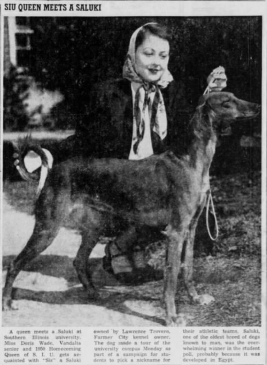 "People all over the Midwest have heard of Egypt and have come to regard our section by that name," the Southern Illinoisan quoted Doc Lingle, one of the presenters, as saying. "So we feel that a nickname connoting something Egyptian and something sporting might be in order. After considerable research, we have deducted that the saluki is the best bet for a name having these features. The saluki has great speed, is intelligent and carries great prestige as the forerunner of sporting dogs."