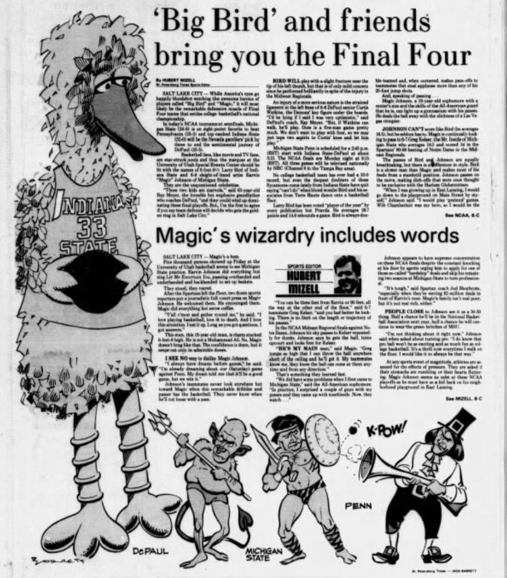 The Evening Sun's Bill Tanton: "At the beginning of the season, Indiana State was picked third or fourth in its own conference. Now the Sycamores are 33-0, they are ranked No. 1 in the country, and they are one win from the title. Their coach, Bill Hodges, is in his first year, the first rookie ever to take an undefeated team to the tournament final. But everyone knows why Indiana State is where it is. It's because of Bird."