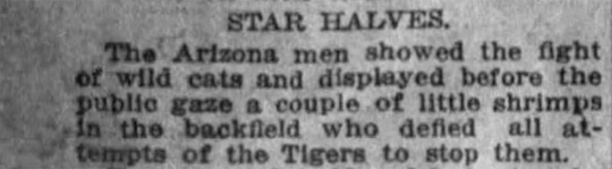 "Confident of rolling up a big score, the Tigers took the field with grins on their faces, but before the game was ten seconds old they knew they had a battle on their hands," Henry wrote. The headline of the story was "Tigers Take A Hard Game" and one of the subheadlines was "Arizona Puts up Unexpected Struggle."