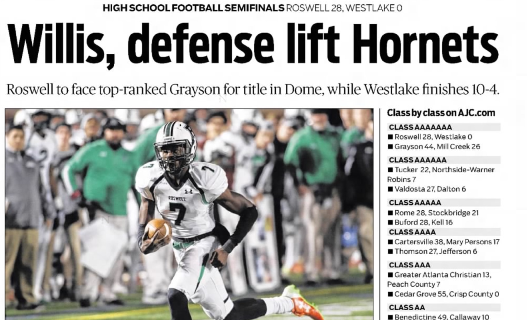 As a senior at Roswell, Willis led his team to the Class AAAAAAA championship game with an undefeated record but Roswell fell to Grayson High School 23-20 in overtime at the Georgia Dome. It was the second season in a row in which Roswell lost in the championship game. Willis forced overtime on the final play of regulation with a 20-yard touchdown pass. He had 301 yards of total offense in the game, including a team-high 40 rushing yards.