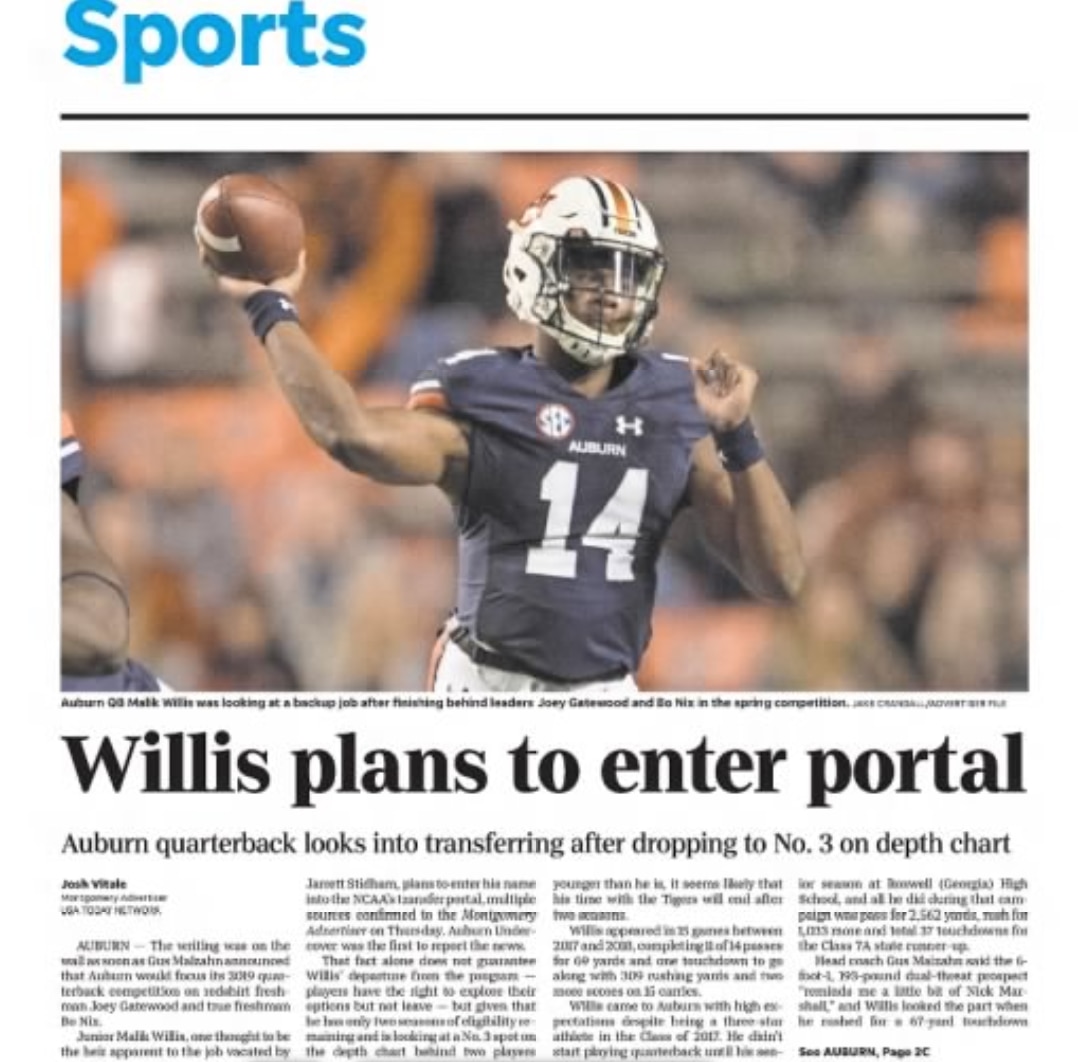 The Montgomery Advertiser's Josh Vitale: "The writing was on the wall as soon as Gus Malzahn announced that Auburn would focus its 2019 quarterback competition on redshirt freshman Joey Gatewood and true freshman Bo Nix. Junior Malik Willis, (once) thought to be the heir apparent to the job vacated by Jarrett Stidham, plans to enter his name into the NCAA's transfer portal."