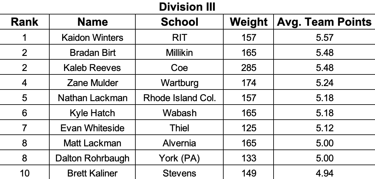 RIT 157-pounder Kaidon Winters leads in the race for Division III Most Dominant with 5.57 team points per match but is followed closely by the tandem of Millikin 165-pounder Braden Birt and Coe heavyweight Kaleb Reeves who are both averaging 5.48 team points per match.