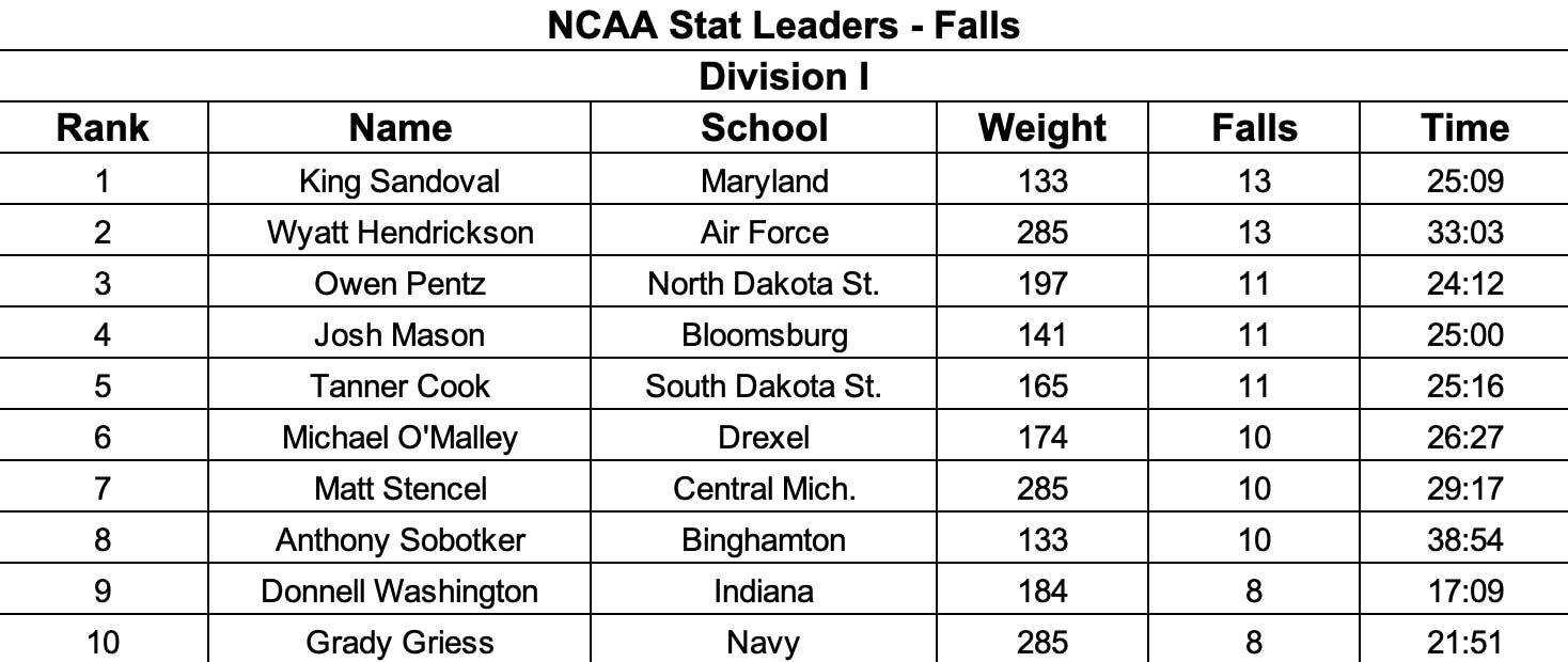 King Sandoval of Maryland and Hendrickson of Air Force continue to pace Division I in falls with 13 on the season. Sandoval had a 31-second fall against Columbia on Friday as his nearly eight-minute advantage in aggregate time (25:09 to 33:03) gives him the tiebreaker over Hendrickson.