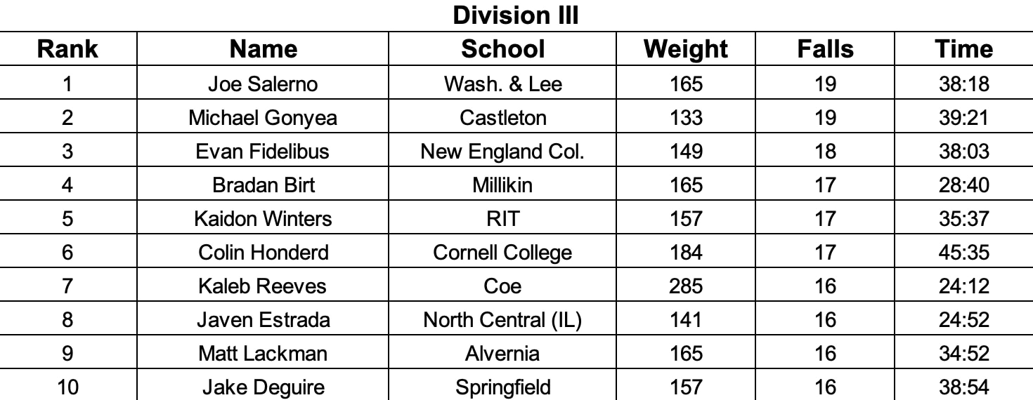 Division III has a new leader in falls as Washington & Lee 165-pounder Joe Salerno has reached 19 falls and holds a 1:03 aggregate time advantage over Michael Gonyea of Castleton’s 19 falls. Salerno and Gonyea hold a two-fall lead over the next group which is led by the top two wrestlers in the Most Dominant standings of Birt and Winters.
