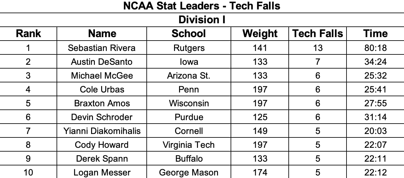 Rutgers’ Rivera defeated Princeton 20-3 on Friday to earn his 13th tech fall of the season and move six ahead of Iowa’s Austin DeSanto. DeSanto earned his 7th tech fall of the season on Sunday with a 22-7 win against Nebraska.